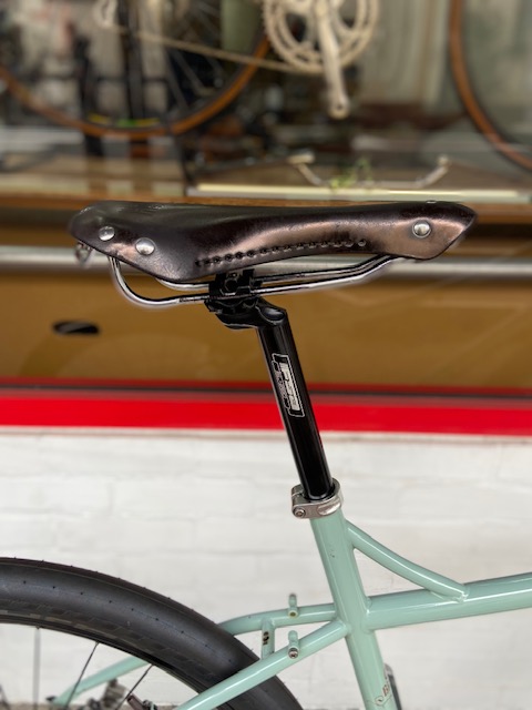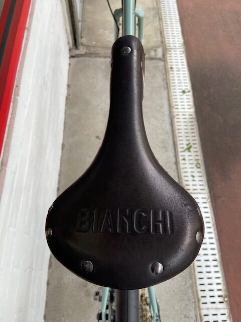 取付されている部品の中にはBIANCHIで以前発売されていた貴重なレザーサドル、バルブキャップを装着しています。
